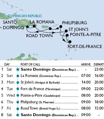 - 7 night cruise from Dominican Republic to Antigua & Barbuda, Martinique, Guadeloupe, St Maarten and British Virgin Islands (Sat-Sat)